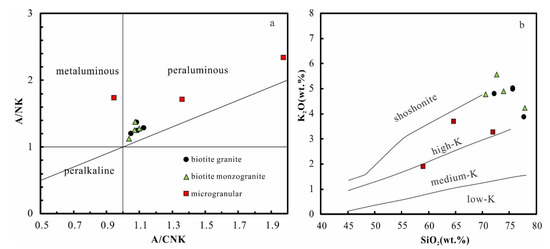 (a) A/CNK vs. A/NK diagram [53]; (b) SiO2 vs. K2O diagram (solid lines from [54]).