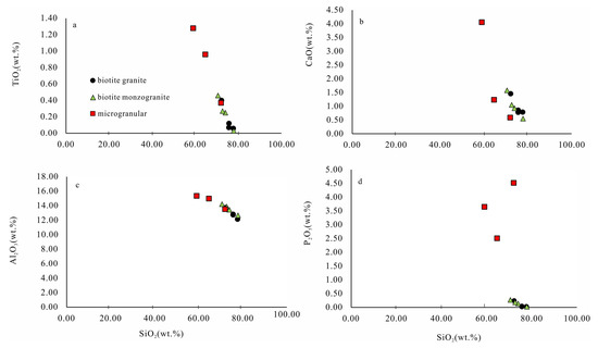 Both the host granites and the MEs display negative anomalies of Eu, Ba, Sr, Zr, P and Ti (Figure 8a). The decreasing trends of Al2O3, TiO2, and CaO with increasing SiO2 for the Xitian host granites and the MEs are related to ilmenite, plagioclase, and biotite presence (Figure 7). It is worth noting that these chemical variations of host granites are in accordance with the crystal fractionation sequence of ferromagnesian minerals, plagioclase, Ti-Fe oxides, and apatite.