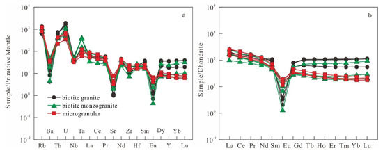 (a) Primitive-normalized trace element spider diagram of the Xitian intrusion; (b) Chondrite-normalized REE patterns for the Xitian intrusion. Normalized values are from [55].