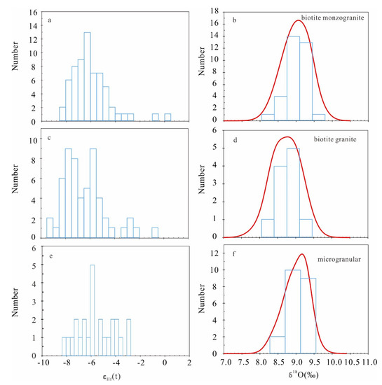 Hf isotope analyses were conducted on zircon grains that were previously analyzed for U-Pb dating. Zircons from the MEs have similar Hf isotopic compositions compared with the host biotite granites (Figure 9). Most of the analyzed zircon grains show low 176Lu/177Hf ratios (<0.002); thus, the analytical 176Hf/177Hf ratios can be used to represent the isotopic compositions of magmas at the time of formation [48]. The dated at about 150 Ma magmatic zircons from MEs samples (XTS-1 and XTS-2b) have 176Hf/177Hf ratios ranging from 0.282448 to 0.282600, corresponding to εHf(t) values from −8.16 to −2.93 (average of −5.61). Zircons from the granites (samples 2609, 2706, 2702, 2704, 2708, 2614, 2711, and 2713) have variable Hf isotopic compositions with εHf(t) values ranging from −9.08 to 0.32 (average of −6.19). The granites and MEs have two-stage Hf model age (TDM2) values of 1.18–1.78 Ga and 1.39–1.72 Ga, respectively. Three grains have the εHf(t) values around zero, indicating mantle involvement in their genesis. Zircons from the MEs have similar O isotopic compositions compared with the host granites (Figure 9). Zircons from the MEs (samples XTS-1 and XTS-2b) have O isotopic compositions with δ18O values ranging from 8.4‰ to 9.3‰. Eighteen spot analyses were performed on the biotite monzogranite (2609), yielding δ18O values from 8.6‰ to 9.4‰. Fifteen-spot analyses were performed on the granites (2706), yielding δ18O values from 8.4‰ to 9.5‰. Zircon grains from biotite granites (2708) have similar δ18O values from 8.1‰ to 9.2‰. The indistinguishable Lu-Hf and O isotope compositions between biotite granites and biotite monzogranites further confirm their genetic relation. Moreover, both zircon grains of MEs and host granites have similar Lu-Hf isotope compositions, indicating their parental magmas are from the same source.