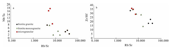 In the process of magmatic evolution, granite can lead to a significant decrease in Cr, Ni, Sr, Ba, as well as a significant increase in the content of Li, Rb, and Cs [81]. Sr is mainly concentrated in magma’s early stage, while Rb is enriched in the residual melts. Therefore, Rb/Sr ratio is close to constant in the early stage of magma evolution, with an average value slightly less than 0.5 [82]. With the enhancement of differentiation, Rb/Sr ratio rapidly increases to more than 10, so Rb/Sr ratio can be used to represent the degree of differentiation. It can be found that both Nb/Ta and Zr/Hf ratios show a significant decrease with the increase of evolution degree (Figure 11).