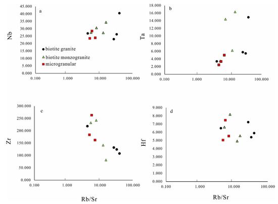 Variations of Rb/Sr versus the concentration of Nb (a), Ta (b), Zr (c), and Hf (d) from the Xitian intrusion.