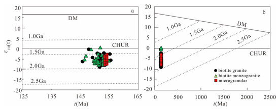 (a) U-Pb ages vs. εHf(t) diagram of zircon of the host granites and (b) MEs from the Xitian intrusion.