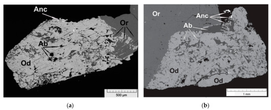 Fragments of odikhinchaite (Od) individuals with albite (Ab) inclusions in association with ancylite-(Ce) (Anc) and orthoclase (Or). BSE images of polished sections.