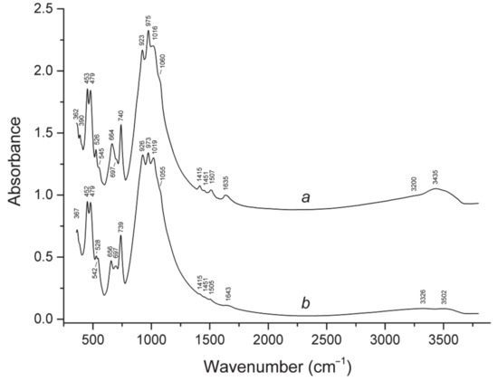 Powder infrared absorption spectra of (a) odikhinchaite and (b) taseqite, both from the Odikhincha alkaline complex.
