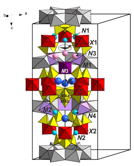 The general formula of EGM can be written as [N1N2N3N4N5]3M16M23M3M4Z3(Si9O27)2(Si3O9)2Ø4–6X1X2, where Z = Zr, Ti, Nb; M1 = Ca, Mn2+, Fe2+, Na, REE; M2 = Fe2+, Fe3+, Mn2+, Zr, Na; M3–4 = Si, Nb, W; N1–5 = Na, Ca, Mn, Sr, K, REE, H2O, H3O; Ø = OH; X = Cl, H2O, CO3. The eudialyte-type crystal structure is based on a heteropolyhedral pseudo-framework built up by the rings of tetrahedra (Si3O9 and Si9O27) and of octahedra (M16O24) connected via M2O4–7 polyhedra and ZO6 octahedra containing additional M3 and M4 sites, which are situated at the centers of two nonequivalent Si9O27 rings and can be filled by additional TØ4-tetrahedra (predominantly occupied by silicon) or (MØ6)-octahedra (occupied by different cations having octahedral coordination) [1,2]. Five extra-framework sites, N1–5, are usually occupied by Na, but the N3 and N4 sites may contain significant and even dominant amounts of other cations (K+, Ca2+, Mn2+, Sr2+, REE3+). In so-called “hydroeudialytes”, the N sites contain H2O molecules in significant amounts [1]. The X1 and X2 sites located on the three-fold axis are occupied by extra-framework anions (Cl–, F–, OH–, S2–, SO42–, and CO32–) and water molecules.
