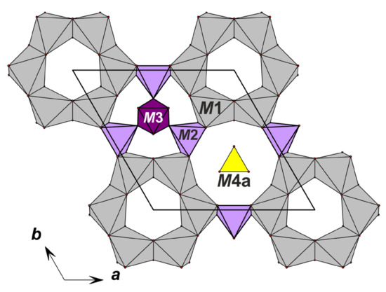 - Rastsvetaeva, R.K.; Chukanov, N.V.; Zaitsev, В.А.; Aksenov, S.M.; Viktorova, K.A. Crystal structure of Cl-deficiente analog of tasekite from the Odihincha massif. Crystallogr. Rep. 2018, 63, 392–400. [Google Scholar] [CrossRef]