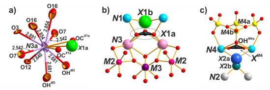Local coordinational environments of the N3a site (a), the X1 site (b), and the X2 site (c).