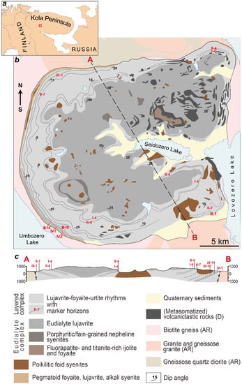 (a) location of the Lovozero massif within the Kola Peninsula (red square); (b) geological scheme of the Lovozero massif and (c) cross-section along the line A–B [].