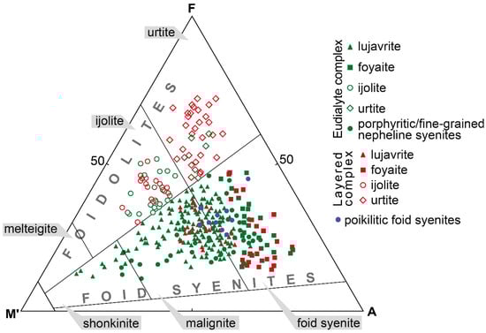The Lovozero massif is composed of alkaline rocks, which are either foid syenites or foidolites. According to International Union of Geological Sciences (IUGS), these rocks are modally defined in the QAPF fields 11 and 15 []. Depending on the content of mafic minerals, nepheline syenites are additionally subdivided into shonkinite (M’ = 60–90 modal %, where M’ is defined as a sum of mafic minerals minus muscovite, apatite, primary carbonates), malignite (M’ = 30–60) and nepheline syenite (M’ < 30), and foidolites are subdivided into melteigite (M’ = 70–90), ijolite (M’ = 30–70), and urtite (M’ < 30) (Figure 2). Note that names of rocks for the Lovozero massif, as well as for the Ilimaussaq massif, are outdated, but suitable for use, e.g., lujavrite and foyaite, are widely used. Figure 2 shows the correspondence of the rock names used in this article to the nomenclature of the IUGS.