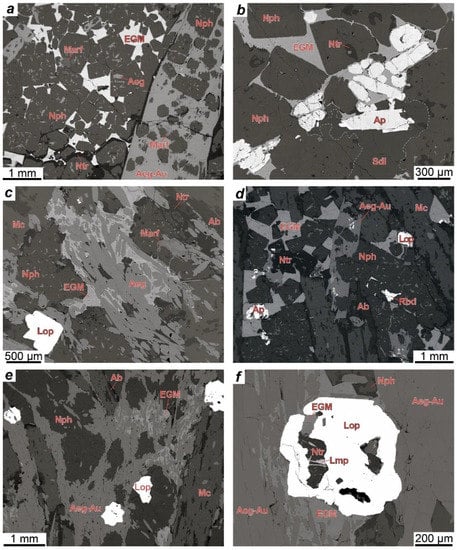 Lujavrite (meso- or melanocratic nepheline syenite, Figure 2) consists of microcline, nepheline, clinopyroxenes (aegirine, aegirine-augite), and amphiboles (magnesioarfvedsonite, arfvedsonite) and has a trachytoid texture. Long prismatic crystals of clinopyroxenes and amphiboles are grouped into a communicating system of “streams”, as in ijolite. Such “streams” of mafic minerals flow around alkali feldspar and nepheline crystals. Typical accessory minerals of lujavrite are sodalite, loparite-(Ce), the EGM, lamprophyllite, and baritolamprophyllite. Sodalite forms euhedral or round crystals, (barito)lamprophyllite form poikilitic crystals, and loparite-(Ce) is usually present as skeletal twins. The EGM are in the interstices of clinopyroxenes and amphiboles, inside the “streams” (Figure 3e). The small EGM grains are often located inside skeletal crystals of loparite-(Ce) (Figure 3f). Overall, the EGM content in lujavrite is lower than in urtite and foyaite (average 2%, maximum 10% []).