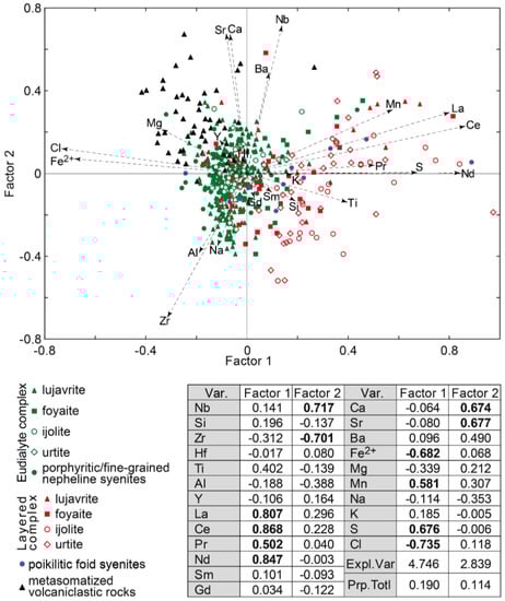 Factor analysis of data on the EGM composition showed that they are divided into three groups (Figure 5). The first group includes the EGM enriched in Fe2+, Mg, Cl, as well as in Zr. These are the EGM from rocks of the Eudialyte complex, mainly melanocratic (eudialyte lujavrite and ijolite). Among the rocks of the Eudialyte complex, the maximum contents of the elements listed above are typical of porphyritic/fine-grained nepheline syenite, and the minimum—for foyaite.