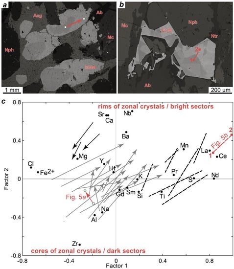 (a) BSE-image of the oscillatory zonal EGM grains from the ijolite LV-222-151; (b) BSE-image of the sector-zoned EGM grains from the foyaite LV-IV-3-5; (c) position of the points shown in Figure 6a (red arrow) and Figure 6b (red dotted line) in the coordinates of the Factor 1 vs Factor 2 (see the results of factor analysis in Figure 5). The gray arrows show some examples of the oscillatory zoning (the arrow is directed from the core to the rim) in the EGM from magmatic rocks. The black arrows show some examples of the oscillatory zoning (the arrow is directed from the core to the rim) in the EGM from metasomatized volcaniclastic rocks. Black dotted lines show some examples of the sector zoning in the EGM.