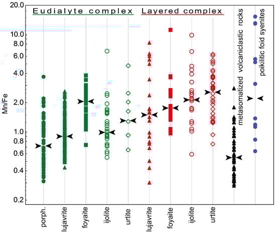 The Mn/Fe ratio of eudialytes has been suggested as a monitor for magmatic evolution by various authors [,,,]. In general, the Mn/Fe ratio of both melt and EGM increase with fractionation. This ratio is controlled by (1) the fractionation stage and composition of the coexisting melt, (2) the partition coefficients of Fe and Mn for eudialyte-melt, and (3) co-crystallizing minerals []. The latter point implies that the EGM incorporate elements that are left after the crystallization of simultaneously and previously crystallizing Mn- and Fe-incorporating minerals. The Mn/Fe ratio in the EGM from all types of rocks varies very widely. In general, this ratio increases from lujavrite to urtite (i.e., from mela- and mesocratic to leucocratic rock) within both Eudialyte and Layered complexes. Moreover, the Mn/Fe ratio increases from the Eudialyte complex to the Layered complex (Figure 7), and this change occurs due to a decrease in the iron content (Figure 8).