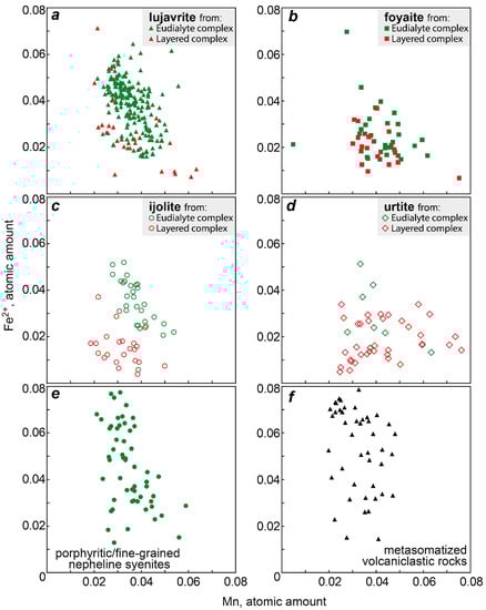 Atomic amount Fe2+ vs atomic amount Mn in the EGM from different rocks of the Lovozero massif. (a) Fe2+ vs Mn in the EGM from lujavrite; (b) Fe2+ vs Mn in the EGM from foyaite; (c) Fe2+ vs Mn in the EGM from ijolite; (d) Fe2+ vs Mn in the EGM from urtite; (e) Fe2+ vs Mn in the EGM from porphyritic/fine-grained nepheline syenites; (f) Fe2+ vs Mn in the EGM from metasomatized volcaniclastic rocks.