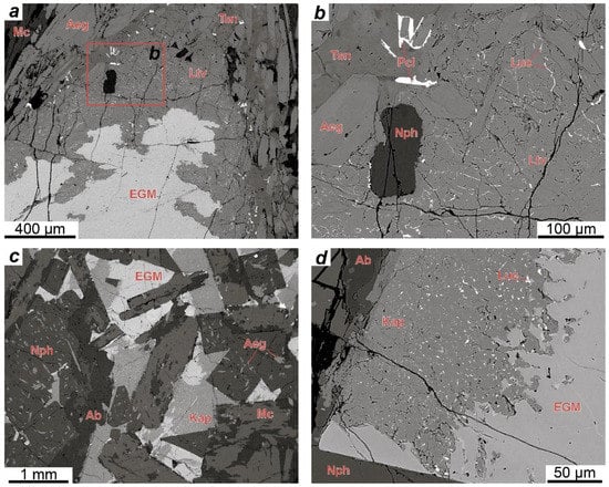 In foyaite and urtite, the content of mafic minerals decreases, clinopyroxenes, and amphiboles form large poikilitic crystals (Figure 3a), and the spatial connection between the EGM and mafic minerals disappears. During the transition from lujavrite to foyaite and urtite, the modal content of the EGM increases []. In foyaite and urtite, the EGM also crystallized at a late magmatic stage in the interstices of rock-forming minerals (Figure 3a,b,d). For example, in urtite, the EGM crystallized later than fluorapatite (Figure 3b), which is a late magmatic mineral [].