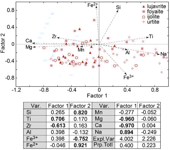 The clinopyroxenes from rocks of the Layered complex differ by the content of Ca, Mg (diopside end-member), and Na, Fe3+ (aegirine end-member). According to the results of factor analysis (Figure 10), the higher concentration of Ca, Mg (and Zr) is in clinopyroxenes from lujavrite. The content of sodium and ferric iron is greater in clinopyroxenes from urtite, and foyaite and ijolite are in an intermediate position. Thus, changes in the compositions of clinopyroxenes and EGM indicate that each rhythm of the Layered complex consists of less- (lujavrite) and more-evolved (urtite) rocks.