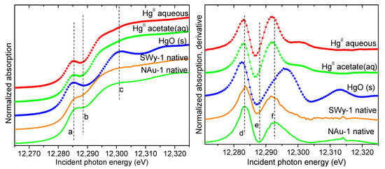 The reaction of Hg(II) with the native clays is not expected to result in reduction of Hg(II), as a priori the solids have no reducing equivalents to be transferred to Hg (the clay purification process and the reactions with Hg(II) were carried out under ambient (i.e., oxic) conditions). Thus, the spectra measured from the native oxidized solids are expected to represent Hg(II) adsorbed onto the corresponding clays. Figure 2 compares the data to aqueous and solid Hg(II) standards. The edge position and shape of the clay samples is similar to the Hg(II) standards, showing a characteristic “knee” between 12,285 eV and 12,290 eV corresponding to the deep dip and the large second peak in the derivative spectra near 12,287 eV and 12,292 eV, respectively. Although there is speciation-dependent variation in their position and amplitude, these features in the XANES are present in all Hg(II) spectra and have been used for determining Hg(II) in prior work [45,46,48,49]. Therefore, Hg associates with the native clays as adsorbed Hg(II) and these spectra represent the speciation of solid-phase Hg(II) in the absence of redox processes.