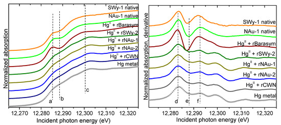 Hg LIII-edge XANES spectra (left) and derivative (right) obtained from the solid phase in the systems with native NAu-1 and SWy-2 clays. The spectra are compared to aqueous and solid Hg(II) standards (symbols), which exhibit a deep dip and the large second peak in the derivative spectra (features e and f). The vertical dashed lines (a–f) are a guide to the eye.