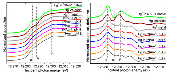 Hg LIII-edge XANES spectra (left) and derivative (right) from the solids in the rNAu-1 systems at pH 5–9 compared to standards (symbols). The vertical dashed lines (a–f) are a guide to the eye, delineating features corresponding to the different valence states of Hg.