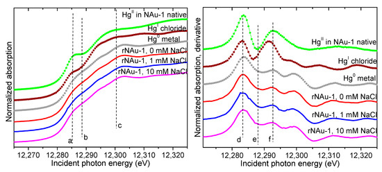 Hg LIII-edge XANES spectra (left) and derivative (right) from the solids in the rNAu-1 systems with increasing NaCl concentrations compared to standards (symbols). The vertical dashed lines (a–f) are a guide to the eye, delineating features corresponding to the different valences of Hg.