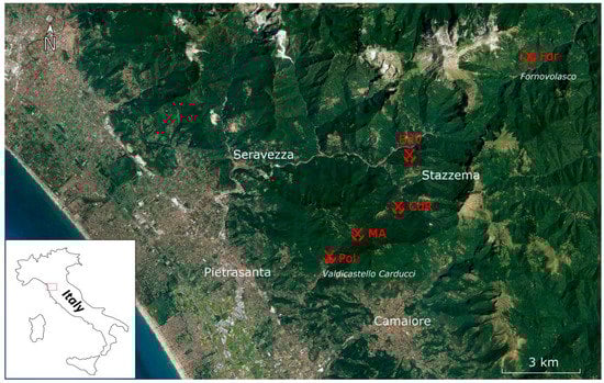 - Lattanzi, P.; Benvenuti, M.; Costagliola, P.; Tanelli, G. An overview on recent research on the metallogeny of Tuscany, with special reference to the Apuan Alps. Mem. Soc. Geol. Ital. 1994, 48, 613–625. [Google Scholar]