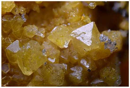Giacovazzoite, ideally K5Fe3+3O(SO4)6(H2O)9·H2O, is a new species recently discovered at the Monte Arsiccio mine, sharing some structural relationships with metavoltine-group minerals [4]. Indeed, it displays a [Fe3+3O(SO4)6(H2O)3]5– cluster, occurring also in metavoltine and related compounds [32]. Giacovazzoite occurs as prismatic crystals, orange-brown in color, up to 0.1 mm in size, with a vitreous luster (Figure 11). It shows a perfect {100} cleavage. It is associated with alum-(K), gypsum, krausite, magnanelliite, and scordariite. The crystallographic investigation of giacovazzoite revealed its isotypic relationship with the synthetic β-Maus’s salt described in [33]. Unit-cell parameters are a = 9.4797(2), b = 18.4454(5), c = 18.0540(4) Å, β = 92.626(2)°, space group P21/c. The empirical chemical formula of giacovazzoite is K5.06Fe3+2.98O(SO4)6.00·10H2O, in agreement with the ideal formula [4].