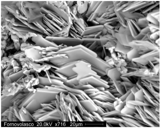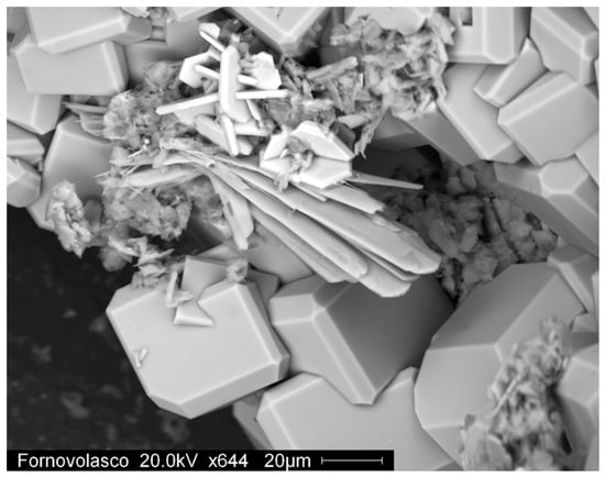 At Fornovolasco, alunogen is very rare and it was identified on the basis of EDS chemical data, showing Al:S atomic ratios close to 2:3, and on the basis of the tabular morphology. Indeed, it was observed only once as μm-sized tabular crystals, associated with voltaite (Figure 4).