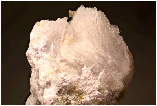At Fornovolasco, epsomite occurs in sulfate piles occurring in the 740 m level (one of the oldest tunnels of the mining complex), along with an intermediate member of the halotrichite-pickeringite series, melanterite, gypsum, magnesiocopiapite, and wilcoxite [28]. It usually forms anhedral, colorless, grains or prismatic individuals, whereas thin needles, up to 3 cm in length, are rarer (Figure 9). Chemical analysis (performed in EDS mode) showed Mg, S, and minor Fe as the only elements with Z > 8 above the detection limit. This result was confirmed by the crystal structure refinement that pointed to a chemical composition (Mg0.74Fe0.16)(SO4)(H2O)6·H2O [28]. Unit-cell parameters, refined from SC-XRD data, are a = 11.8664(3), b = 12.0150(3), c = 6.8598(2) Å, space group P212121 [28].