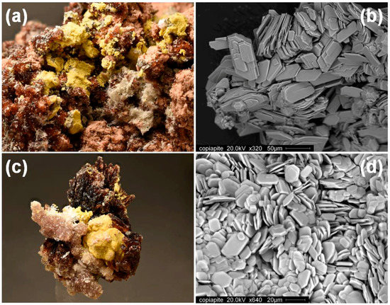 Copiapite group minerals from the pyrite ores of the Apuan Alps. (a) Magnesiocopiapite, as microcrystalline canary-yellow masses up to 5 mm across, with brown römerite and hairy halotrichite from the Fornovolasco mine. (b) Details of the crystal morphology of magnesiocopiapite from the previous locality. (c) Magnesiocopiapite, as rounded aggregates of canary-yellow microcrystals, up to 1 cm across, associated with krausite, halotrichite, and römerite, from the Monte Arsiccio mine. (d) A copiapite group mineral from the Pollone mine, as micrometer-sized tabular crystals.