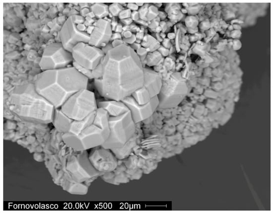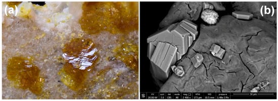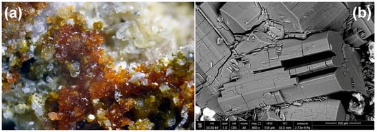 The first identification was performed in the Fornovolasco mine, where coquimbite occurs as pseudohexagonal bipyramidal crystals, less than 50 μm in size, associated with römerite (Figure 7). It was identified through an X-ray powder diffraction (XRPD) pattern collected using a 114.6 mm Gandolfi camera and Ni-filtered CuKα radiation. EDS chemical analyses pointed to an Al/(Fe + Al) atomic ratio of ~0.20, close to the ideal ratio 0.25.