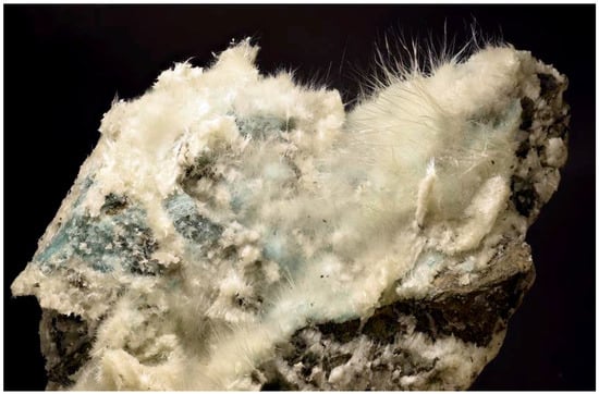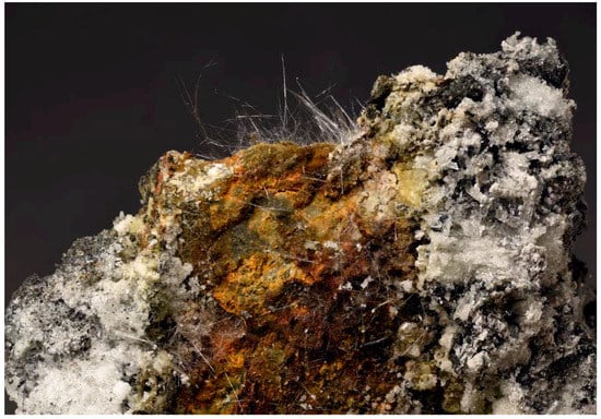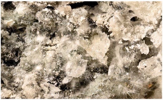 Fibroferrite is a complex hydrated Fe3+ sulfate, ideally Fe3+(SO4)(OH)(H2O)2·3H2O, and can be the result of the oxidation of melanterite [31]. This mineral was found as fine-fibrous crusts, with a silky luster, greyish-white in color (Figure 10), in the Fornovolasco mine, in close association with melanterite, as revealed by an XRPD pattern collected using a 114.6 mm Gandolfi camera and Ni-filtered CuKα radiation. Qualitative EDS chemical analyses showed Fe and S as the only elements with Z > 8 above the detection limit. The identification of fibroferrite was further confirmed through micro-Raman spectroscopy.