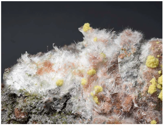 In addition to minor sulfate occurrences (e.g., epsomite formed on metadolostone) and to the widespread presence of gypsum on the walls of mining works, the main attention is focused on the most important sulfate assemblage where more than 15 different mineral species have been identified, among which the three new K-Fe3+ sulfates giacovazzoite, magnanelliite, and scordariite [4,5,6]. Here, a microcrystalline pyrite ore body is embedded within whitish quartzitic phyllites, mineralogically formed by quartz and mica with variable amounts of chlorite, with tourmalinite layers representing a common feature. As reported by Vezzoni et al. [77], these rocks are enriched in K2O, likely as a consequence of a Permian hydrothermal alteration event. This K2O enrichment is likely the main reason for the abundance of K-sulfates in the assemblage from Monte Arsiccio, where the action of H2SO4 is able to cause the leaching of aluminosilicates, that may be the main source of K [23].
