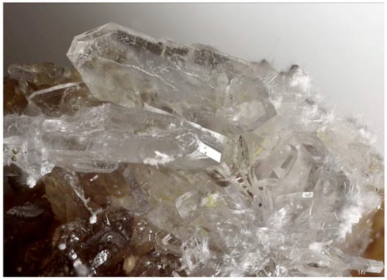 Khademite is a relatively rare fluo-sulfate with ideal composition Al(SO4)F(H2O)5, whose troubled definition has been recently reviewed by Košek et al. [49]. In the secondary assemblages from the pyrite ores of the Apuan Alps, khademite was identified as colorless to whitish tabular crystals (Figure 15), up to 5 mm in size, associated with coquimbite, halotrichite, and krausite, in the sulfate assemblage from the Monte Arsiccio mine [50]. Chemical analysis pointed to the formula Al0.96S1.02O4[F0.84(OH)0.16]·5H2O. Unit-cell parameters, refined through SC-XRD data, are a = 11.1713(2), b = 13.0432(3), c = 10.8815(2), space group Pcab [50]. Khademite is the second fluo-sulfate identified in the sulfate assemblages from the Apuan Alps and it was fully characterized through SC-XRD and micro-Raman spectroscopy by Mauro et al. [50].