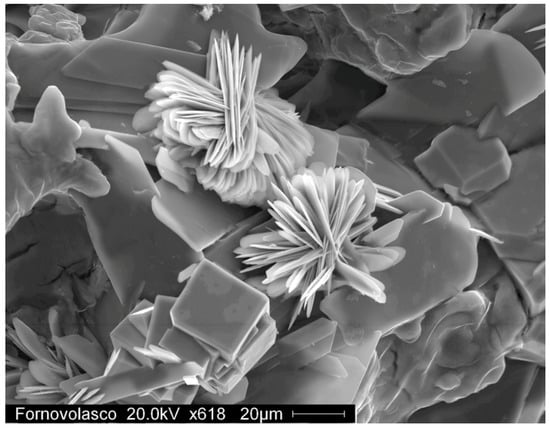 The first report of krausite from the pyrite ores of the Apuan Alps was given by Mauro [51] from the Fornovolasco mine, where this mineral was identified on the basis of qualitative EDS chemical analyses and an XRPD pattern collected using a 114.6 mm Gandolfi camera and Ni-filtered CuKα radiation. Krausite occurs as rosettes composed by thin tabular colorless crystals, less than 50 μm in length, associated with voltaite, alunogen and alum-(K) (Figure 16).