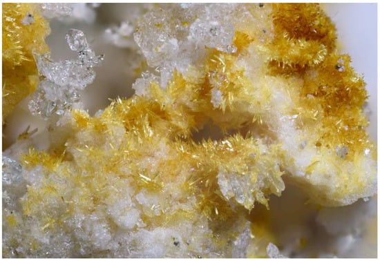 Magnanelliite, K3Fe3+2(SO4)4(OH)(H2O)2, is a recent addition to the sulfate systematics after its discovery at the Monte Arsiccio mine by Biagioni et al. [6]. It occurs as prismatic crystals, steeply terminated, up to 1 mm in length, occurring as isolated individuals or as divergent intergrowths (Figure 18). Color ranges from light yellow to orange. Magnanelliite is typically associated with other K-sulfates and, in particular, with alum-(K) and krausite. In addition, it has been observed in association with anhydrite, giacovazzoite, gypsum, halotrichite, jarosite, melanterite, scordariite, and voltaite. Its empirical formula is (K2.98Na0.04)Σ3.02(Fe3+2.08Al0.05Mg0.01)Σ2.14S3.93O16(OH)(H2O). Unit-cell parameters are a = 7.5491(3), b = 16.8652(6), c = 12.1574(4) Å, β = 94.064(1)°, space group C2/c [6]. Magnanelliite is the Fe3+-analogue of alcaparrosaite, ideally K3Ti4+Fe3+(SO4)4O(H2O)2 [54].
