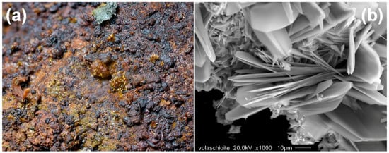 - Biagioni, C.; Bonaccorsi, E.; Orlandi, P. Volaschioite, Fe3+4(SO4)O2(OH)6·2H2O, a new mineral species from Fornovolasco, Apuan Alps, Tuscany, Italy. Can. Miner. 2011, 49, 605–614. [Google Scholar] [CrossRef]