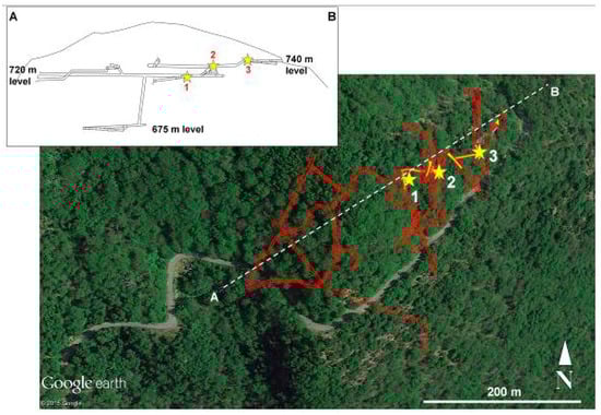 The main orebodies are hosted within the Apuane Unit and, in particular, in a Paleozoic metavolcanic-metasedimentary sequence, locally tourmalinized, and close to the contact with overlying Triassic metadolostone belonging to the “Grezzoni” Formation. A review of the main geological features of these deposits is given in [9,10].