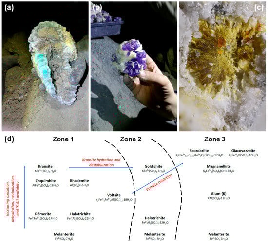 Melanterite is the first oxidation product of pyrite in the Monte Arsiccio mine (a). In the sulfate sequence, it is followed by several species, showing increasing oxidation and the addition of other elements (e.g., K, Al). Several of these species (voltaite, coquimbite, krausite) are included in halotrichite, as exemplified by the purple crystals of coquimbite embedded in fibrous white halotrichite (b). Krausite, in the outer portion of the sulfate assemblage, tends to hydrate and to be destabilized, being replaced by other phases. In (c), a radial aggregate of krausite, 5 mm in diameter, is almost fully replaced by magnanelliite, scordariite, and giacovazzoite, and it is embedded in alum-(K). In (d), the most characteristic species identified in the Monte Arsiccio sulfate assemblage are reported, according to their occurrence in different zones, from the core of the pyrite ore body (Zone 1) towards the surface (Zone 3), passing through the intermediate Zone 2.