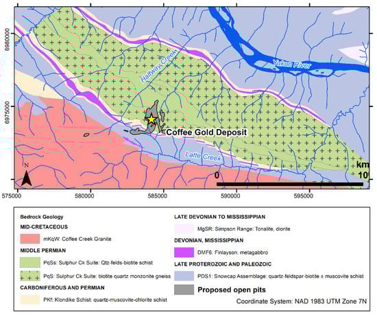 Geological map showing the bedrock geology underlying the Coffee deposit and the proposed mine pit locations. Bedrock geology from ref. [].