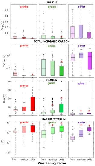 Sulfur, total inorganic carbon (TIC), U, and U/Ti by rock type and by weathering facies in Coffee drill-core samples. Red stars indicate median U or U/Ti is significantly higher (p < 0.05); or TIC and sulfur content is significantly lower (p < 0.05) in transition or oxide facies than in fresh facies for a given rock type (Mann–Wilcox Test).