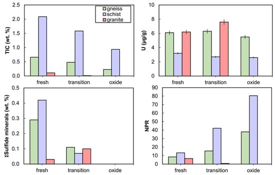Solid-phase composition of rocks used in kinetic tests: total inorganic carbon (TIC), uranium, sum of sulfide minerals (from quantitative evaluation of materials by scanning electron microscopy, QEMSCAN), and neutralization potential ratio (NPR) as a function of rock type and weathering facies. Error bars on U abundance are ±5%.