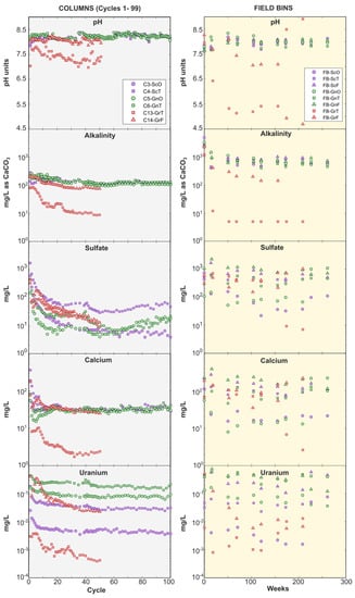 Column (left panel) and field bin (right panel) leachate pH, alkalinity, sulfate, Ca, and U. For column tests, only cycles representing Phase 1, i.e., prior to the sequencing experiments, are shown (i.e., cycles 1 to 99). Note differences in y-axis scale between left and right panels. Symbol shape indicates weathering facies: triangles = fresh; squares = transition; circles = oxide. Color indicates lithology: green = gneiss; red = granite; purple = schist.