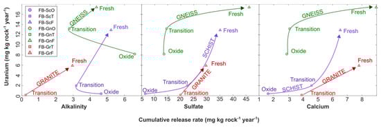 Cumulative U release rate in field-bin experiments against release rates of alkalinity (left), sulfate (middle) and calcium (right). Arrows indicate trend from oxide to transition to fresh weathering facies in each rock type.