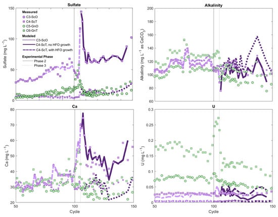 We considered an additional series of simulations to assess whether the oxidation of sulfide minerals in the schist-transition column could have led to growth in HFO over time (as per Reaction (1)), and thus increased U sorption capacity during the experiment. Quantifying HFO growth as pyrite oxidation progresses is highly complex given the evolution in surface area/volume and the possible Fe-oxide phase transformation and recrystallization reactions that occur with ageing []. Growth in HFO was modeled by assuming that the rise in sulfate concentrations in the schist-transition column between cycles 60 and 99, which was highly linear (Supplementary Figure S9), translated to proportional and linear growth in HFO availability over time. By applying an HFO growth rate that was 1/100th the rate of per-cycle sulfate concentration increase between cycles 60 and 99, and assuming that this growth rate remained constant during Phase 3, the PHREEQC model provided a better match to experimental U data (RMSE = 0.012) (Figure 7). These simulations suggest that addition of Fe(III)-(oxyhydr)oxides during oxidation of this rock might have led to increasing U sorption capacity, while this effect was unlikely in the schist-oxide experiment where the lack of sulfide-mineral weathering precluded HFO genesis.