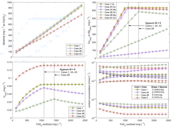 Modeled alkalinity (top left), Ca and Mg (top right), and U (bottom left) concentrations, and sorbed species (bottom right) onto HFO in hypothetical batch reactions involving FeS2 oxidation in the presence of excess carbonate. Arrows indicate approximately when gypsum mineral saturation index reaches 0. The different modeling scenarios are presented in Table 2. The HFO composition that are shown at bottom right are the respective millimolar sums of all U, DIC, Mg, and Ca species that are sorbed in each simulation.