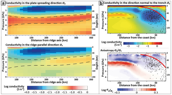 Figure 1. High-conductivity channels at the bottom of the Nazca and Cocos Plates. Comparison between two MT profiles showing anisotropic high-conductivity features below the Nazca Plate ((a) east of the EPR, 3–6 Ma) [1] and within the Cocos Plate ((b) offshore Nicaragua; 22–25 Ma) [3]. For the young Nazca Plate (a), the conductivity reaches only ~   8 × 10 2 S·m−1 in the spreading direction ( σ y ) and σ y / σ x reaches ≈10; for the old portion of the Cocos Plate (b), the conductivity reaches up to ~   2 × 10 1 S·m−1 in the direction normal to the trench ( σ y ) and σ y / σ x ≈2. The dashed black lines locate the anomaly and highlight its anisotropic nature. The thick red line (b) corresponds to the subduction interface.