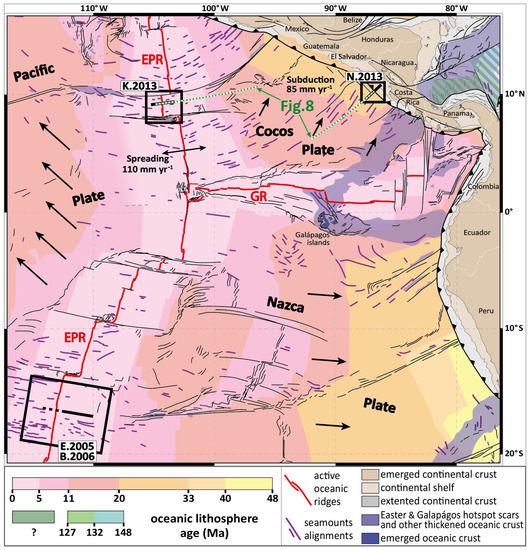 Figure 2. Synthetic map of the Eastern Pacific Ocean. Simplified map built from [19,20] and Google Earth. The spreading rate at the EPR is estimated to 11 cm·yr−1 for the Cocos Plate [7] and 10–15 cm·yr−1 for the Nazca Plate [22]. Large black arrows indicate plate motion direction. MT surveys: EPR = East Pacific Rise; GR = Galápagos Ridge. References: B.2006 = [2]; E.2005 = [1]; K.2013 = [21]; N.2013 = [3].