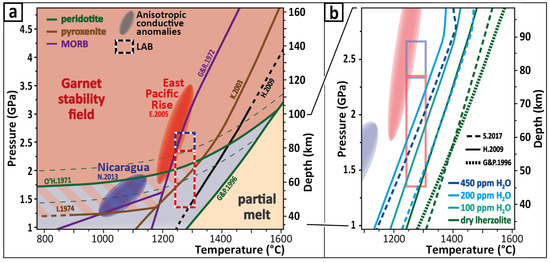 Figure 3. Correlation between electrical anomalies and garnet stability in mantle rocks. (a) Phase diagram showing the P-T conditions for the electrical anomalies offshore Nicaragua (dark blue) [3] and near the EPR (light red) [1] in accordance with Figure 1. (b) Impact of water content on the solidus (i.e., onset of melting) of lherzolite (i.e., fertile peridotite). In both (a) and (b), P-T conditions at the LAB are also indicated for comparison (dark blue and light red boxes). Solidus from [30] are extrapolated for temperatures between 1100 and 1300 °C (plain lines). References: E.2005 = [1]; H.2009 = [30]; G&P.1996 = [31]; G&R.1972 = [32]; I.1974 = [33]; K.2003 = [34]; N.2013 = [3]; O.1971 = [35]; S.2017 = [36].