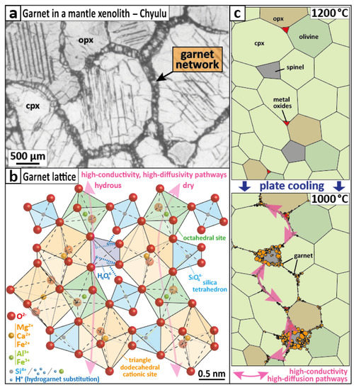 Figure 4. Garnet as a conductive phase in the mantle. (a) Natural garnet network in a mantle xenolith from Chyulu, Southern Kenya [26]. (b) Portion of the garnet structure (adapted from [37]) illustrating the effect of hydrogarnet substitution [38], stabilized by hydrogen bonding [39], on electron pathways (pink). (c) Schematics of an example of the formation of a garnet network through a metamorphic reaction at grain boundaries at 2–3 GPa in a pyroxenite due to progressive plate cooling. As temperature decreases from 1200 to 1000 °C, garnet networks can organize in pyroxene-rich zones, which could explain the conductivity anomaly offshore Nicaragua.